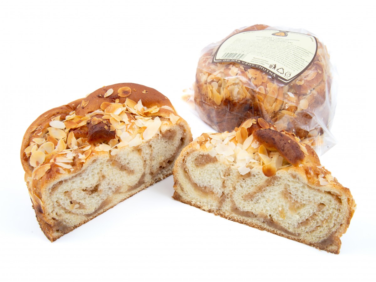Složení: pšeničná mouka, voda, náplň jablečná (40%):/ jablko, cukr, skořice, strouhanka:/ pšeničná mouka, řepkový olej rafinovaný, droždí, jedlá sůl kamenná, cukr, dextróza, sušená syrovátka, sladová mouka ječná a pšeničná, kmín, mák, sezam, enzymy, emulgátory E472e a slunečnicový lecitin E322, kypřící látka E917, látka zlepšující mouku E300, protispékavé látky E535 a E170, regulátor kyselosti E500, stabilizátor E412/, regulátor kyselosti E330/, cukr, řepkový olej rafinovaný, pasterovaná vaječná melanž, droždí, mandle, jedlá sůl kamenná, pšeničný lepek, ječná sladová mouka, sušené mléko odstředěné, glukózový sirup, hrachová vláknina, deaktivované droždí sušené, jablečná dřeň, modifikovaný škrob bramborový E1414, enzymy, emulgátory E471 a E481, konzervační látka E202, kypřící látka E917, látka zlepšující mouku E300, protispékavá látka E535, regulátory kyselosti E330 a E500, aroma vanilin a citronové aroma, barviva E160a a E100.
