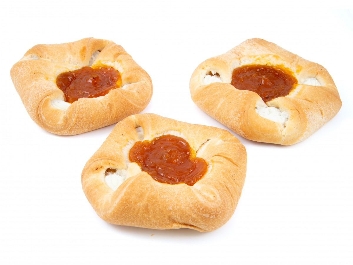 Složení: Pšeničná mouka, voda, náplň tvarohová (25%):/ odtučněné mléko, voda, cukr, modifikovaný škrob, škrob, sušený vaječný bílek, sůl jedlá, mlékárenské kultury, regulátor kyselosti E330, aroma/, náplň meruňková (21%):/ meruňky 44%, fruktózo-glukózový sirup, voda, modifikovaný škrob, zahušťovadlo E418, regulátory kyselosti E330, E331 a E333, barviva E160a a paprikový extrakt, konzervační látka E202, aroma/, palmový tuk, řepkový olej rafinovaný, cukr, droždí, pasterovaná vaječná melanž, pšeničný lepek, ječná sladová mouka, jedlá sůl kamenná, hrachová vláknina, deaktivované droždí sušené, jablečná dřeň, modifikovaný škrob bramborový E1414, emulgátory E471 a slunečnicový lecitin E322, konzervační látky E200 a E202, kypřící látka E917, látka zlepšující mouku E300, protispékavá látka E535, regulátory kyselosti E330 a E500, máslové a citrónové aroma, barvivo karoteny. Minimální trvanlivost 24 hodin. Skladujte v suchých místnostech, bez prachu, v čistých přepravkách na vozíčkách popř. na prázdných přepravkách k tomu určených.