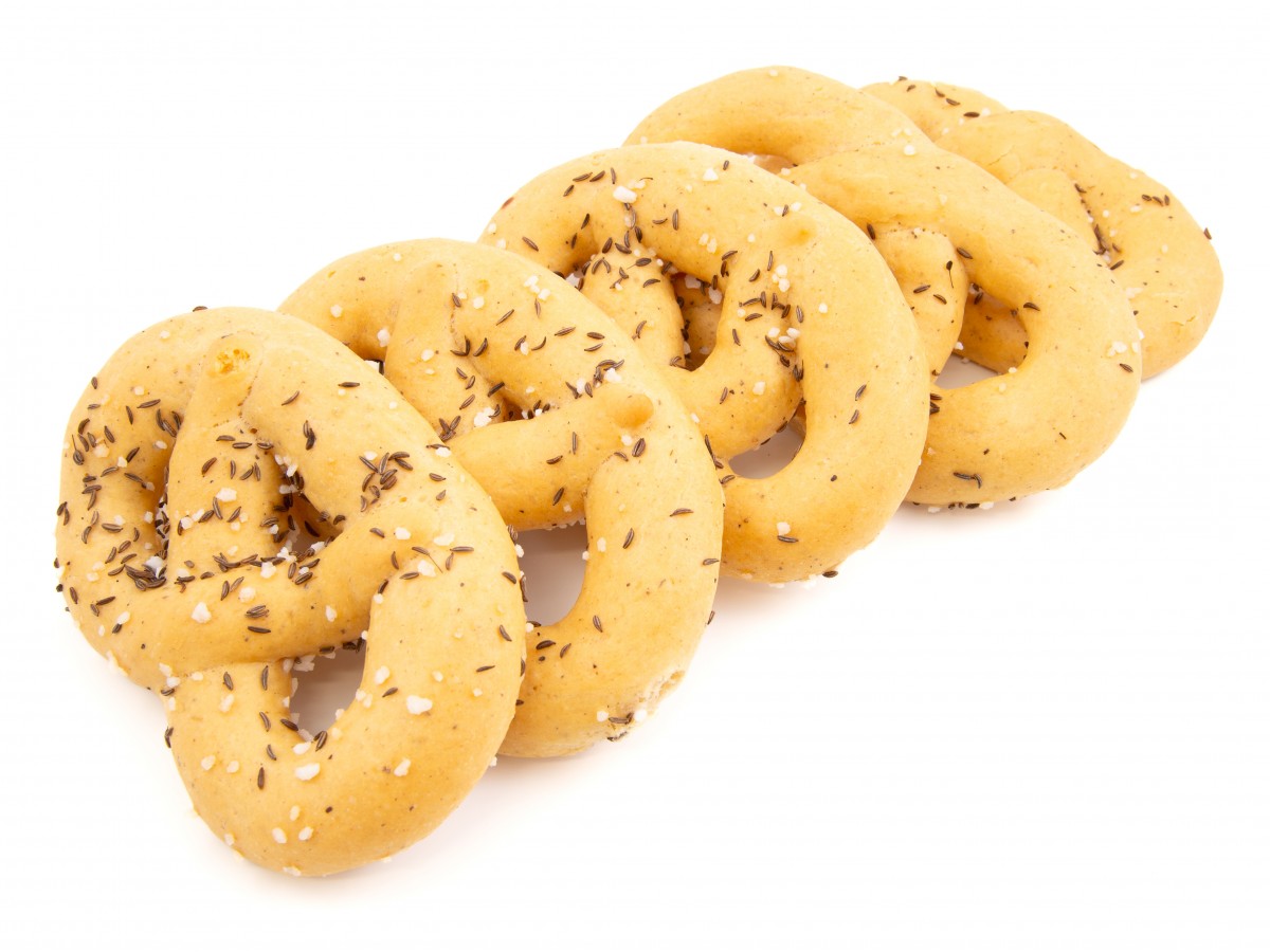 Klasická křupavá pochutina typického tvaru sypaná kmínem a solí.
